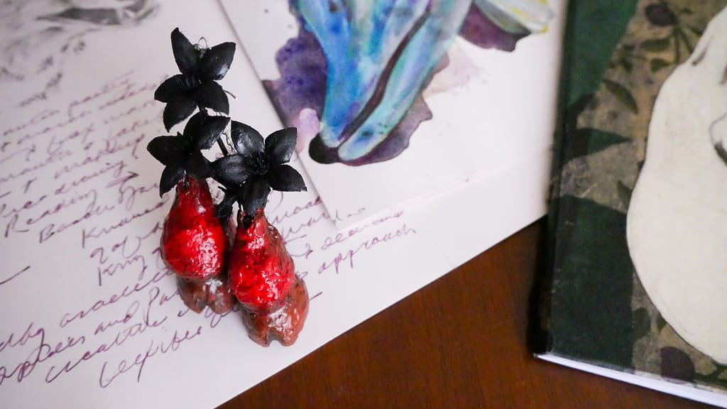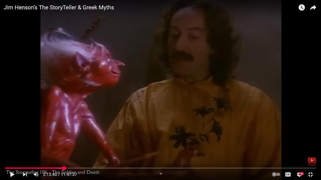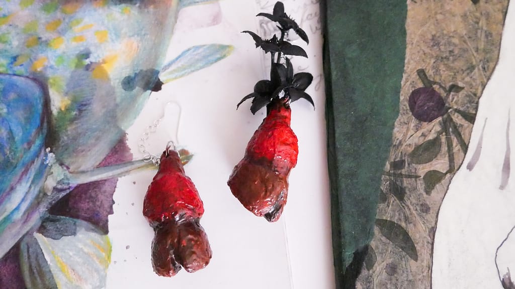 I made myself earrings inspired by the Devil’s foot in Jim Henson’s the Storyteller! You can barely tell, but I am wearing them in certain shots in the video (and in the header image for this post!) The screencaps above are taken from ‘the’ tube but I *DO* own a copy of the DVD series with John Hurt (I don’t have the Greek myths with Michael Gambon and have actually never watched them either.) These are paper mache clay, acrylic paint, and varnished to make them water proof etc.