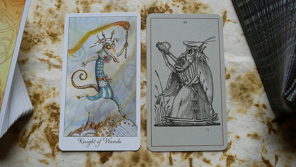 Secondly, I’m interested in the shapeshifting nature of personal characteristics but I want to be very clear that, in my opinion, equating moral or social value with physical appearance is unacceptable. There is enough work on our hands to undo tropes around ‘disfigurement = sign of evil’ in fairy tales and fantasy without adding to it through the misuse of our creativity going forward. The characters in this deck are not automatically marginalised or considered unfavourable. The worldview that created them was flawed (for one thing Rabelais, author of the Gargantua/Pantagruel stories was definitely sexist!) and the worldview of ‘curious persons’ who view and respond to these images will create what they bring to the deck… to put it bluntly.