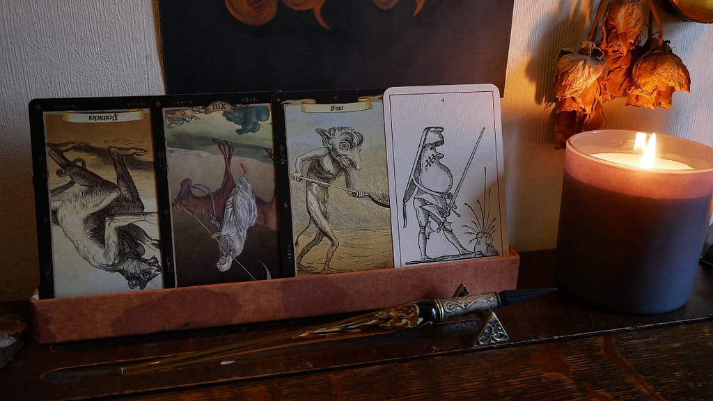 Thirdly, assessment is on-going…but this deck is one step in the much larger personal aim of seeing the world in terms of the imaginative qualities of its inhabitants. I guess you could say I wanted a deck of ‘friends’ to support me in that work. “Familiars”? “Servitors”? Demon-cohorts whose names are Legion?